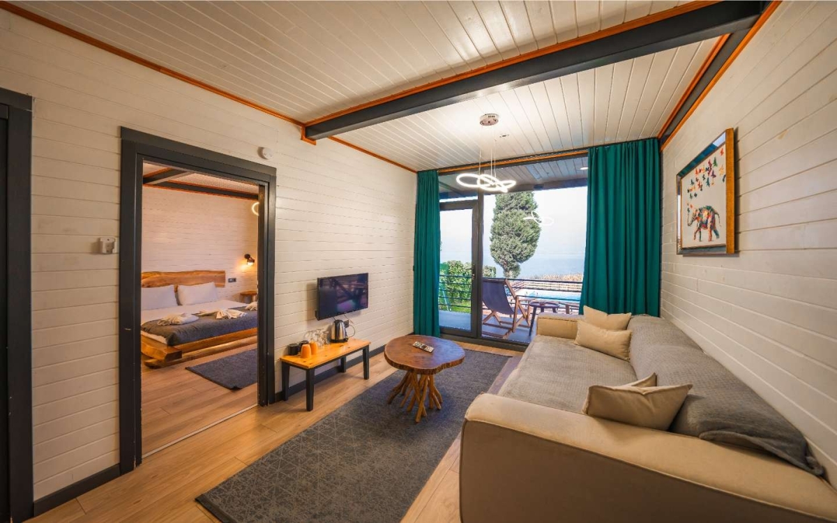Havuz ve Göl manzaralı Delüxe Bungalov: Diğer bungalovlardan bağımsız müstakil jakuzili delüxe bungalov 2 kişilik serpme kahvaltı dahil;